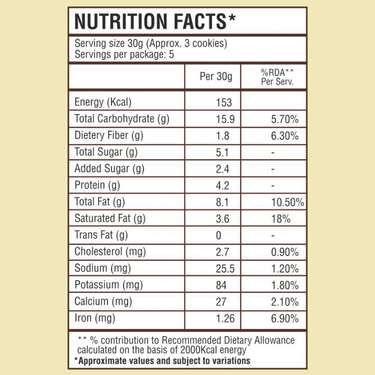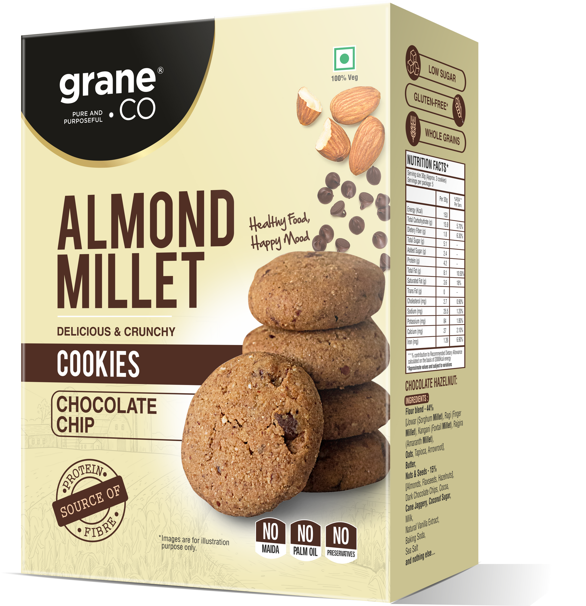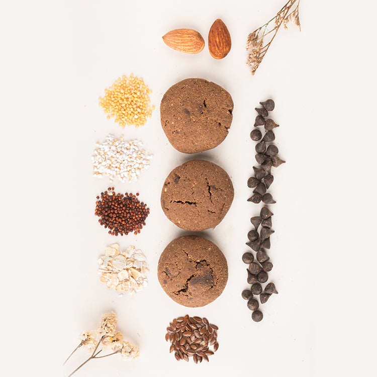 Millet Flour blend - 44% [Jowar (Sorghum Millet), Ragi (Finger Millet), Kangani (Foxtail Millet), Rajgira (Amaranth Millet), Oats, Tapioca, Arrowroot], Butter, Dark Chocolate Chips,
