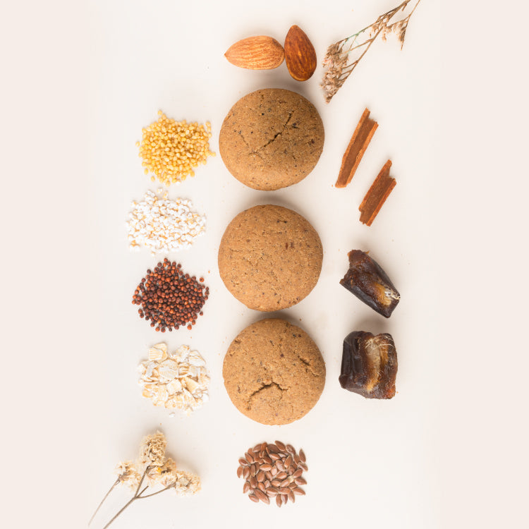 Millet Flour blend - 44% [Jowar (Sorghum Millet), Ragi (Finger Millet), Kangani (Foxtail Millet), Rajgira (Amaranth Millet), Oats, Tapioca, Arrowroot], Butter, Milk, Dates,